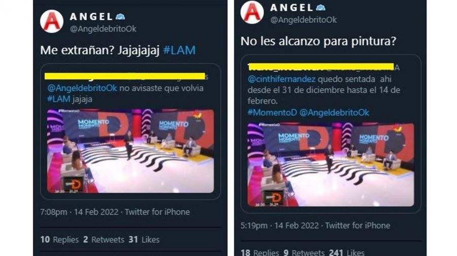 Con su habitual ironía, a través de otros tuits, Ángel de Brito se burló de la similitud de la escenografía de Fabián Doman con la que él tenía en LAM y deslizó los comentarios: "Me estrañan? jajajaja" y "No les alcanzó para pintura?".