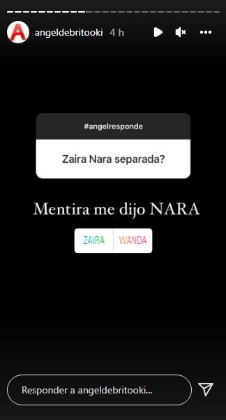 "¿Zaira Nara separada?", indagó uno de sus seguidores. A lo cual Ángel de Brito respondió: "Mentira me dijo NARA", para luego sumar una encuesta que llevaba los nombres de Wanda Nara y su hermana, con la intención de que adivinaran quién habría desmentido la ruptura.
