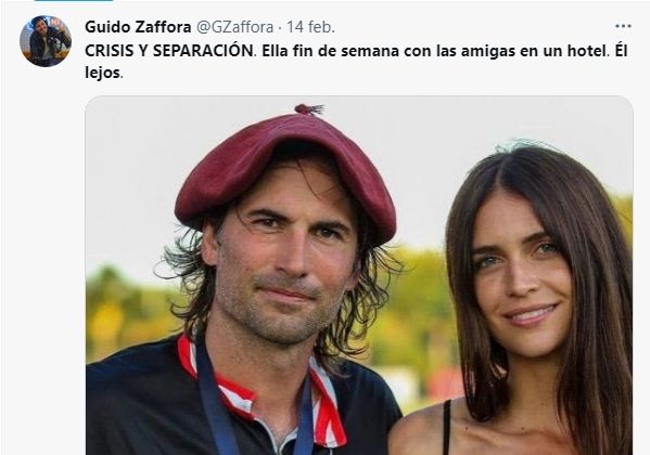 Recordemos que fue Guido Záffora quien lanzó la bomba ayer desde su cuenta de Twitter. "Anunciar una separación esta día es un bajón, ¿no?", comentó el panelista de Es por ahí (América) en relación al Día de los Enamorados. Luego, publicó una foto de la pareja y escribió: "Crisis y separación. Ella, fin de semana con las amigas en un hotel. Él, lejos".