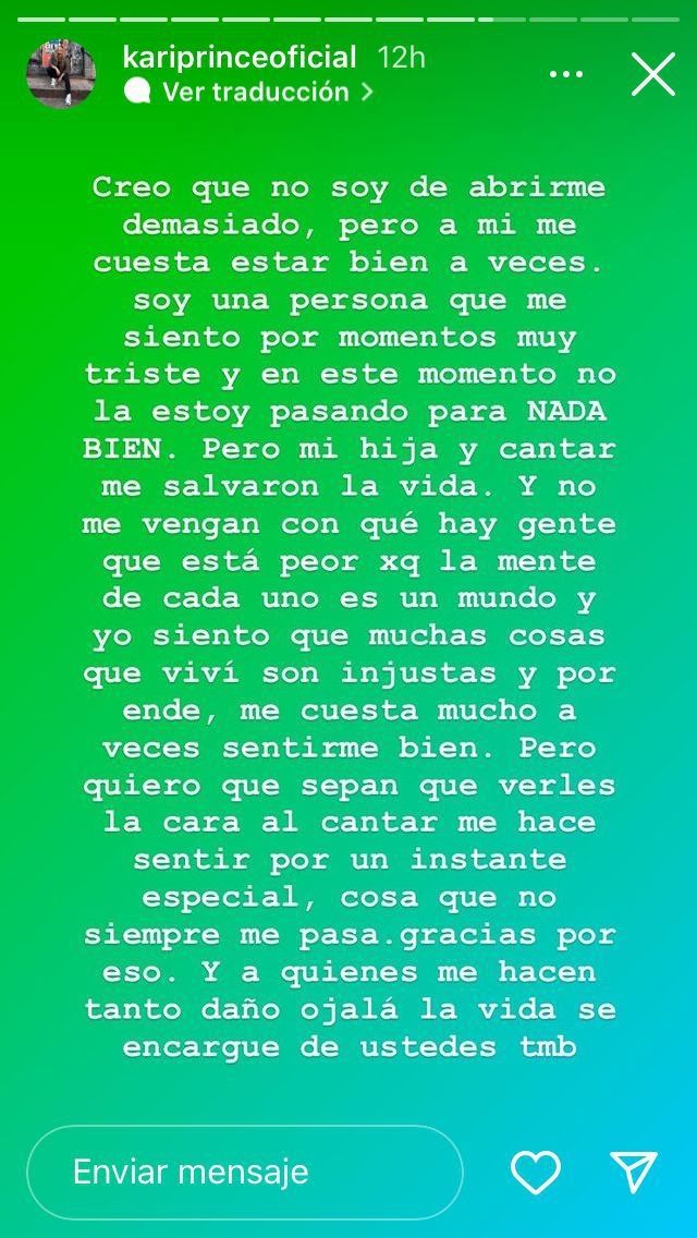 "Verles la cara al cantar me hace sentir especial por un instante, cosa que no siempre pasa; gracias por eso. Y a quienes me hacen tanto daño, ojalá que la vida se encargue de ustedes también", sentenció para finalizar, lo que muchos entendieron como un palito a su ex pareja.