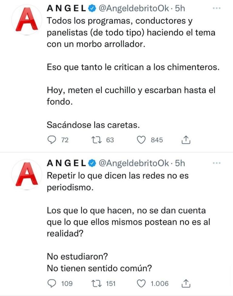 “Todos los programas, conductores y panelistas (de todo tipo) haciendo el tema con un morbo arrollador. Eso que tanto le critican a los chimenteros. Hoy, meten el cuchillo y escarban hasta el fondo. Sacándose las caretas”, disparó filoso Ángel de Brito.
