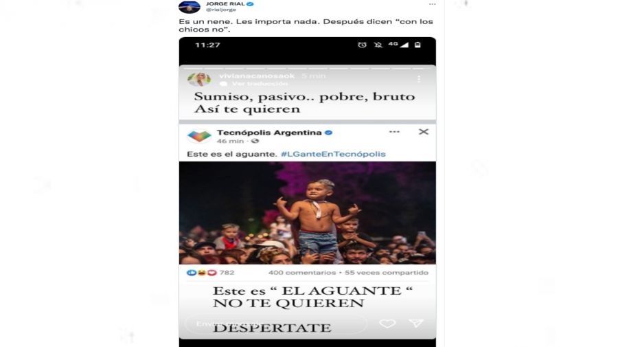 Este martes, Viviana Canosa encendió una fuerte polémica al compartir un filoso comentario sobre la foto de un nene subido a los hombros de uno de sus familiares en el show que dio L-Gante en Tecnópolis. "Así quieren a tus hijos. Sumiso, pasivo... Pobre, bruto, así te quieren. Este es 'el aguante'. No te quieren, despertate", escribió la conductora.