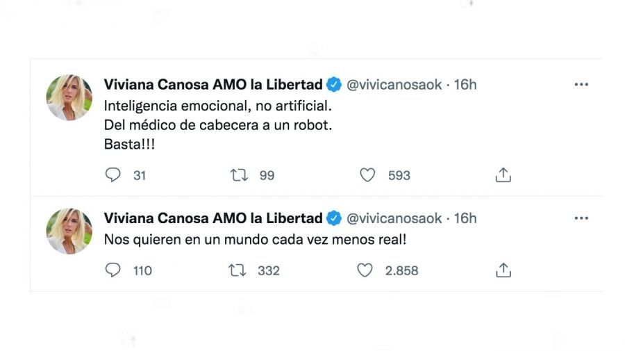 "Lo bueno del boti del @gcba es que cuando toses para ver si tenés covid-19, uno de los espías que te están escuchando te dice salud. Digamos todo", deslizó filoso Rial. Mientras que Canosa compartió varios mensajes en un tono de crítica feroz. "¡Cada vez menos humanos! ¡Nos quieren en un mundo cada vez menos real! Inteligencia emocional, no artificial. Del médico de cabecera a un robot. ¡Basta!", lanzó la conductora de Viviana con vos (A24).