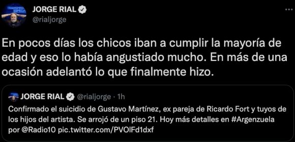 Rial aseguró que desde hace un tiempo la ex pareja de Ricardo Fort se encontraba muy triste. "Confirmado el suicidio de Gustavo Martínez, ex pareja de Ricardo Fort y tutor de los hijos del artista. Se arrojó de un piso 21”, fue el primero mensaje del ex conductor de Intrusos (América TV).