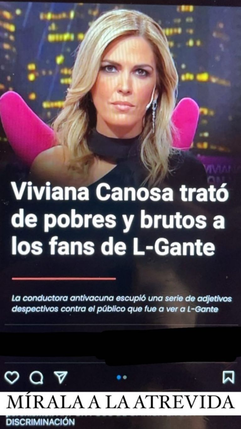 Ante las repercusiones del posteo de Canosa, el músico salió a responderle desde sus redes: "Mirala vos a la atrevida". Luego publicó un video para responderle: "¿Qué onda Viviana Carnosa? Pasivo será tu choma que te la agarrás con un pibito menor de edad para descargar tu odio asqueroso".