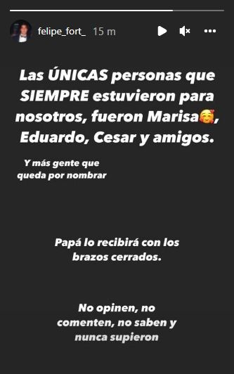 Tras las repercusiones de la trágica noticia, Felipe se expresó en sus redes sociales con un lapidario mensaje contra Martínez. "Las únicas personas que siempre estuvieron para nosotros fueron Marisa, Eduardo, César y amigos. Y más gente que queda por nombrar. Papá los recibirá con los brazos cerrados. No opinen, no comenten, no saben y nunca supieron", expresó en una historia de Instagram.