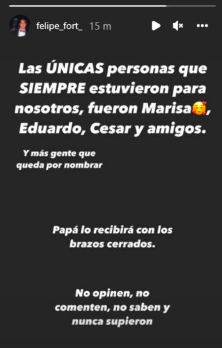 Tras las repercusiones de la trágica noticia, Felipe se expresó en sus redes sociales con un lapidario mensaje contra Martínez. "Las únicas personas que siempre estuvieron para nosotros fueron Marisa, Eduardo, César y amigos. Y más gente que queda por nombrar. Papá los recibirá con los brazos cerrados. No opinen, no comenten, no saben y nunca supieron", expresó en su cuenta de Instagram.