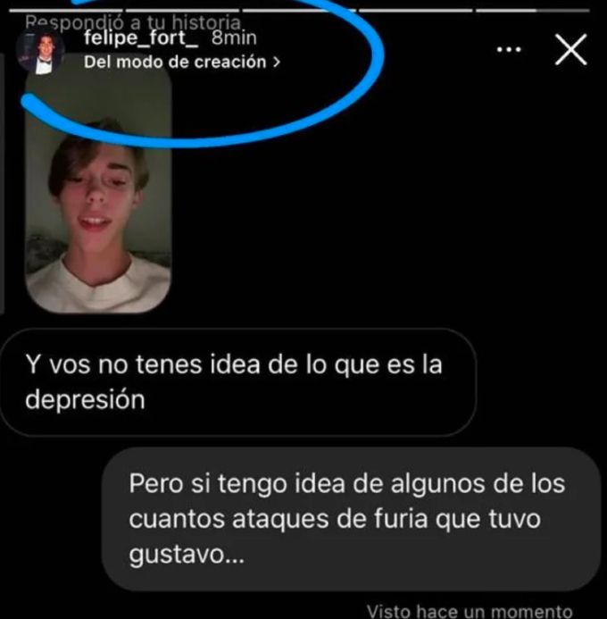Luego de postear el video, que también eliminó horas más tarde, Felipe leyó algunos de los comentarios que recibió y decidió compartir uno de los mensajes privados. "Y vos no tenés idea de lo que es la depresión", le recriminó un seguidor. A lo que Felipe contestó: "Pero sí tengo idea de algunos de los cuantos ataques de furia que tuvo Gustavo".