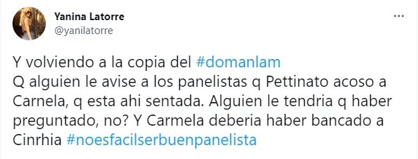 Luego, agregó: "Y volviendo a la copia del #domanlam. Que alguien le avise a los panelistas que Pettinato acosó a Carmela, que está ahí sentada. ¿Alguien le tendría que haber preguntado, no? Y Carmela debería haber bancado a Cinthia #noesfacilserbuenpanelista", comentó.