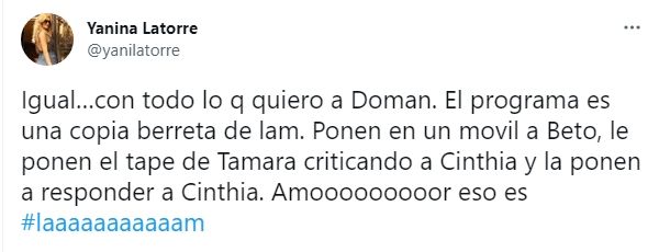 "El programa es una copia berreta de LAM. Ponen en un móvil a Beto (Casella), le ponen el tape de Tamara criticando a Cinthia y la ponen a responder a Cinthia. Amor es LAM", disparó sin filtro la ex angelita.