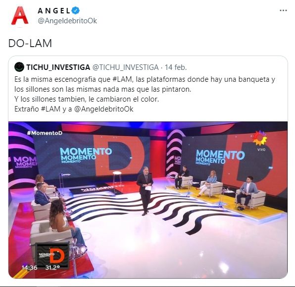 "Es la misma escenografía que LAM, las plataformas donde hay una banqueta y los sillones son las mismas, nada más que las pintaron. Y los sillones también, le cambiaron el color. Extraño LAM y a Ángel de Brito", twitteo un seguidor y Ángel lo citó con el mensaje "DO-LAM".