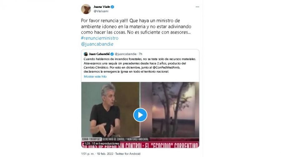 Al regresar de su viaje, Juan Cabandié le respondió a la actriz a través de Twitter: “Hola, Juana Viale. Estamos trabajando conjuntamente con la provincia de Corrientes, a través del Comité de Emergencias que hemos convocado. Desde el Ministerio de Ambiente enviamos 62 brigadistas y personal técnico, 4 aviones hidrantes, camiones autobomba y móviles de apoyo”.