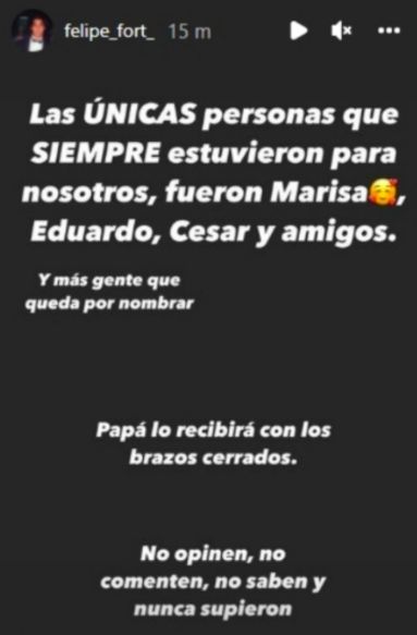 Tras las repercusiones de la trágica noticia, Felipe se expresó en sus redes sociales con un lapidario mensaje contra Martínez. "Las únicas personas que siempre estuvieron para nosotros fueron Marisa, Eduardo, César y amigos. Y más gente que queda por nombrar. Papá los recibirá con los brazos cerrados. No opinen, no comenten, no saben y nunca supieron", expresó en su cuenta de Instagram.
