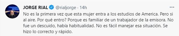 En relación a lo sucedido, Rial expresó en su cuenta de Twitter. "Ojo. La que irrumpió al aire en @americatv hizo el pico de rating del día. Si no la contratan se pierden una estrella", comenzó bromeando.