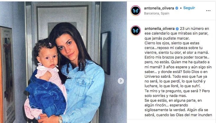 La hija de la célebre mediática se trasladó a Barcelona, con la intención de supurar heridas, de encontrar su propio camino, de abrirse una puerta en ese país. Desde ese lugar, Antonella Olivera decidió armar un posteo en conmemoración de su mamá.