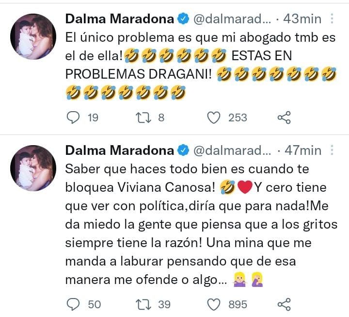 A medida que el conflicto entre ambas siguió escalando, Viviana Canosa bloqueó de sus redes sociales a la hija del Diez. Entonces Dalma Maradona expresó: “¡Saber que hacés todo bien es cuando te bloquea Viviana Canosa! ¡Y cero tiene que ver con política, diría que para nada! ¡Me da miedo la gente que piensa que a los gritos siempre tiene la razón! Una mina que me manda a laburar pensando que de esa manera me ofende o algo…”.