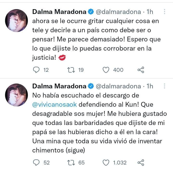 Entonces Dalma Maradona fulminó a Viviana Canosa con un lapidario tuit. “¡Qué desagradable sos, mujer! Me hubiera gustado que todas las barbaridades que dijiste de mi papá, se las hubieras dicho a él en la cara! Una mina que toda su vida vivió de inventar chimentos. Ahora, se le ocurre gritar cualquier cosa en tele, y decirle a un país como debe ser o pensar! Me parece demasiado! Espero que lo que dijiste lo puedas corroborar en la justicia!”, sentenció la actriz.