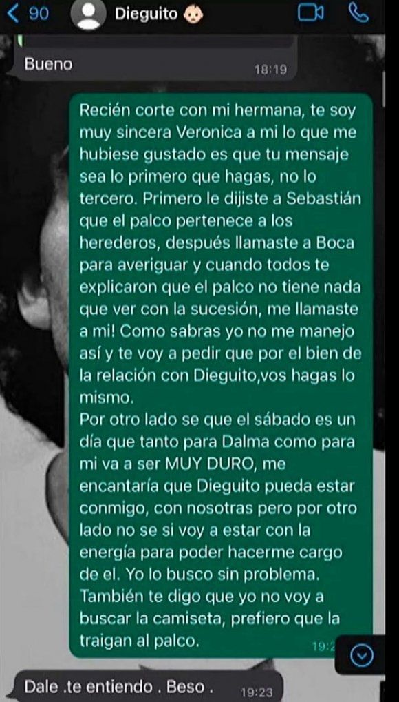 "Primero le dijiste a Sebastián (Baglietto, el administrador de la herencia de Diego Maradona) que el palco pertenece a los herederos, después llamaste a Boca para averiguar. Y cuando todos te explicaron que el palco no tiene nada que ver con la sucesión, me llamaste a mí", siguió.