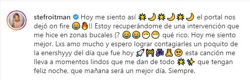 Si bien se mostró con mucha energía, lo cierto es que tuvo que afrontar una operación en la boca de la que no dio mayores detalles. "Hoy me siento mejor. Lxs amo mucho y espero lograr contagiarles un poquito de la enershyyy del día que fue hoy, esta canción me lleva a momentos lindos que me dan de todo, que tengan feliz noche, que mañana será un mejor día. Siempre", agregó.