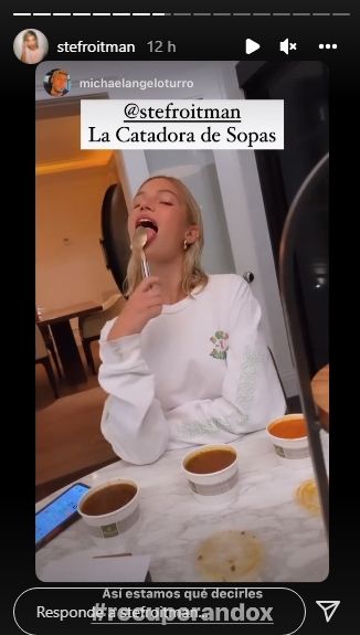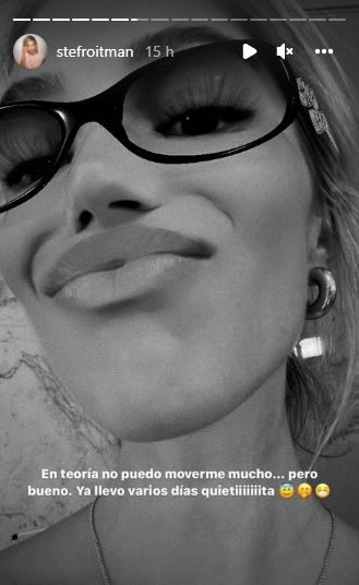 Luego, en sus historias contó: "En teoría no puedo moverme mucho... pero bueno. Ya llevo varios días quietita", aseguró en una selfie. Por la operación que tuve que realizarse, Roitman sólo puede consumir comida líquida. "La catadora de Sopas", escribió al repostear la historia de un amigo, y aseguró: "Así estamos qué decirles #recuperandox".
