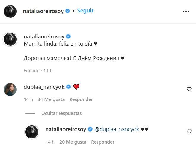 Verónica Lozano, mientras se recupera en Aspen de su operación de talones, le deseó un feliz cumple a Mabel, así como Eleonora Wexler, Mariana Brey, Daniel Rinaldi e, incluso, Nancy Dupláa, que dejó un corazón rojo que Nati respondió con dos mini corazones.