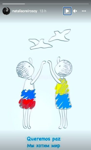 En este contexto, la artista decidió romper el silencio y se expresó en sus redes sociales. En sus stories, publicó un dibujo de dos personas, una con los colores de la bandera de Rusia y otra con los de Ucrania, y ambas tratando de alcanzar dos palomas. "Queremos paz", se puede leer, tanto en ruso como en español.