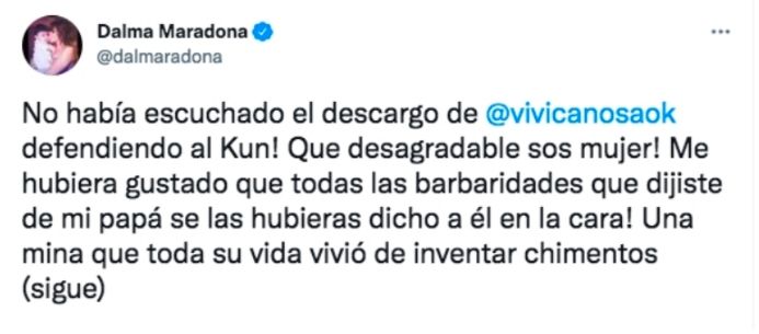 "No había escuchado el descargo de @vivicanosaok defendiendo al Kun! Que desagradable sos mujer! Me hubiera gustado que todas las barbaridades que dijiste de mi papá se las hubieras dicho a él en la cara! Una mina que toda su vida vivió de inventar chimentos", expresó. "Ahora se le ocurre gritar cualquier cosa en tele y decirle a un país como debe ser o pensar! Me parece demasiado! Espero que lo que dijiste lo puedas corroborar en la justicia!", agregó amenazante.