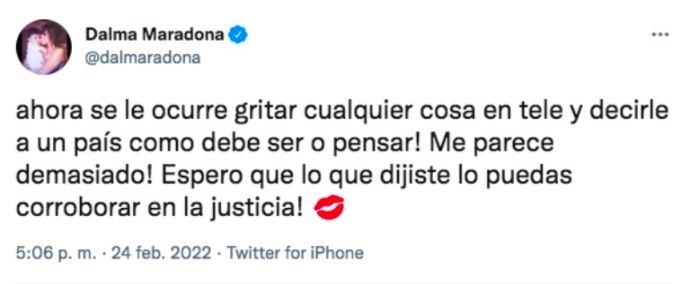 "Mañana vamos a hablar de verdad Dalma Maradona de qué plata vivís vos y tu familia. Tu viejo le cobraba a Chávez, a Maduro y a Fidel... Mañana cuento de qué viven uds., las Maradona, yo de mi laburo....", concluyó con firmeza.