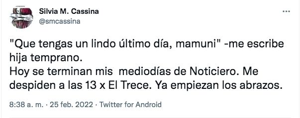 "Que tengas un lindo último día, mamuni" -me escribe hija temprano. Hoy se terminan mis mediodías de Noticiero. Me despiden a las 13 x El Trece. Ya empiezan los abrazos", publicó.