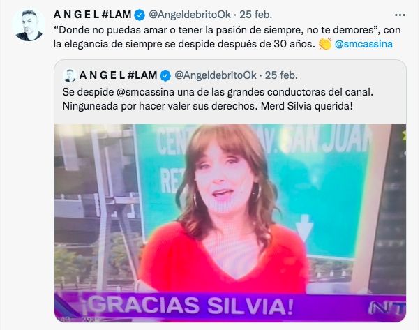 "Se despide @smcassina una de las grandes conductoras del canal. Ninguneada por hacer valer sus derechos. Merd Silvia querida", expresó Ángel en su cuenta de Twitter. Luego, destacó las palabras que usó la periodista al despedirse de su audiencia: "'Donde no puedas amar o tener la pasión de siempre, no te demores', con la elegancia de siempre se despide después de 30 años", expresó el conductor.