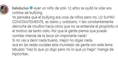 Una de las famosas que habló sobre la discriminación fue Belu Lucius en su cuenta personal de Instagram. Dejó de lado por un rato el humor que la caracteriza y decidió escribir un breve posteo sobre el bullying en todas sus facetas, sin centrarse únicamente en los más chicos.