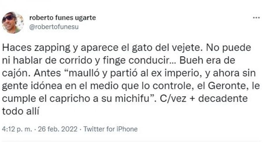 "Haces zapping y aparece el gato del vejete. No puede ni hablar de corrido y finge conducir... Bueh, era de cajón. Antes maulló y partió al ex imperio, y ahora sin gente idónea en el medio que lo controle, el Geronte, le cumple el capricho a su michifu. Cada vez más decadente todo allí", lanzó en un primer mensaje.