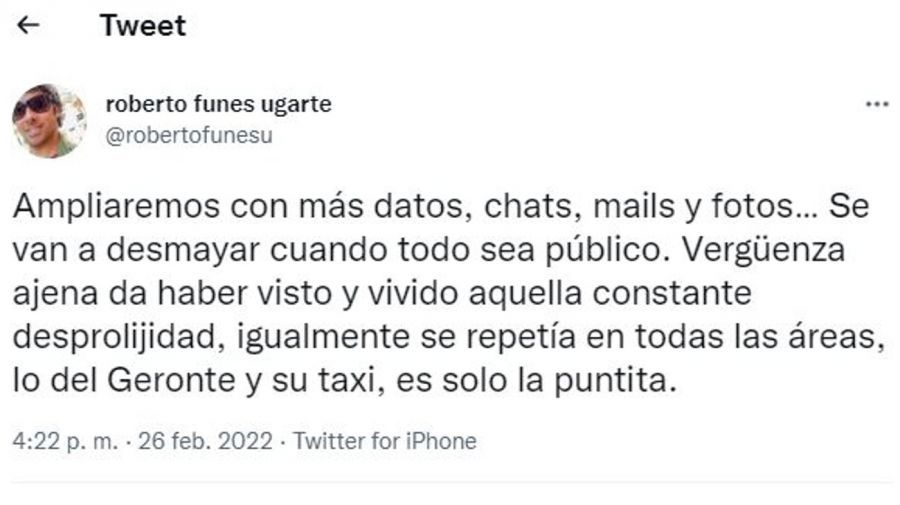 Luego, en otro posteo Robertito Funes Ugarte advirtió: "Ampliaremos con más datos, chats, mails y fotos… Se van a desmayar cuando todo sea público. Vergüenza ajena da haber visto y vivido aquella constante desprolijidad, igualmente se repetía en todas las áreas, lo del Geronte y su taxi, es solo la puntita".