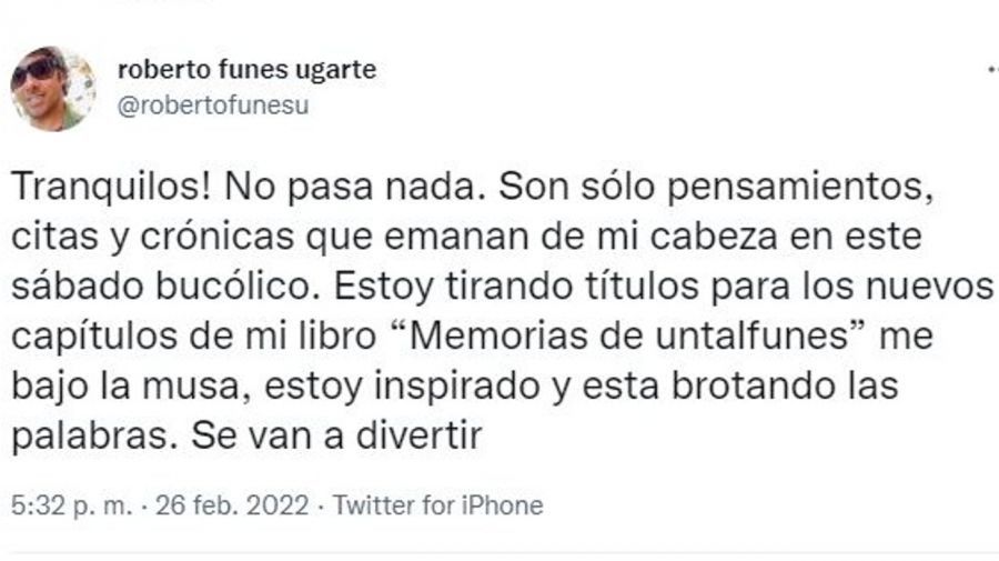 Finalmente, ante el impacto de sus tuits, Funes Ugarte expresó: "Tranquilos! No pasa nada. Son sólo pensamientos, citas y crónicas que emanan de mi cabeza en este sábado bucólico. Estoy tirando títulos para los nuevos capítulos de mi libro 'Memorias de untalfunes'. Me bajo la musa, estoy inspirado y esta brotando las palabras. Se van a divertir".
