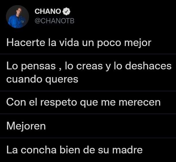 Recordemos que Chano se viene mostrando muy activo en las redes sociales. El cantante busca sentirse más cercano a sus fanáticos, quienes lo acompañaron durante su recuperación a las adicciones. Fue entonces cuando publicó una serie de tuits. En primera instancia comentó: "Hacerte la vida un poco mejor". Luego, "Lo pensas, lo creas y lo deshaces cuando quieras". Minutos más tarde agregó: "Con el respeto que me merecen, mejoren".