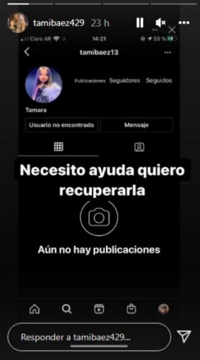 Enterada de lo sucedido, armó una nueva cuenta donde realizó un desesperado pedido: "Necesito ayuda, quiero recuperarla", expresó la joven. "Están enviando mensajes desde mi número de WhatsApp", agregó Tamara indignada.