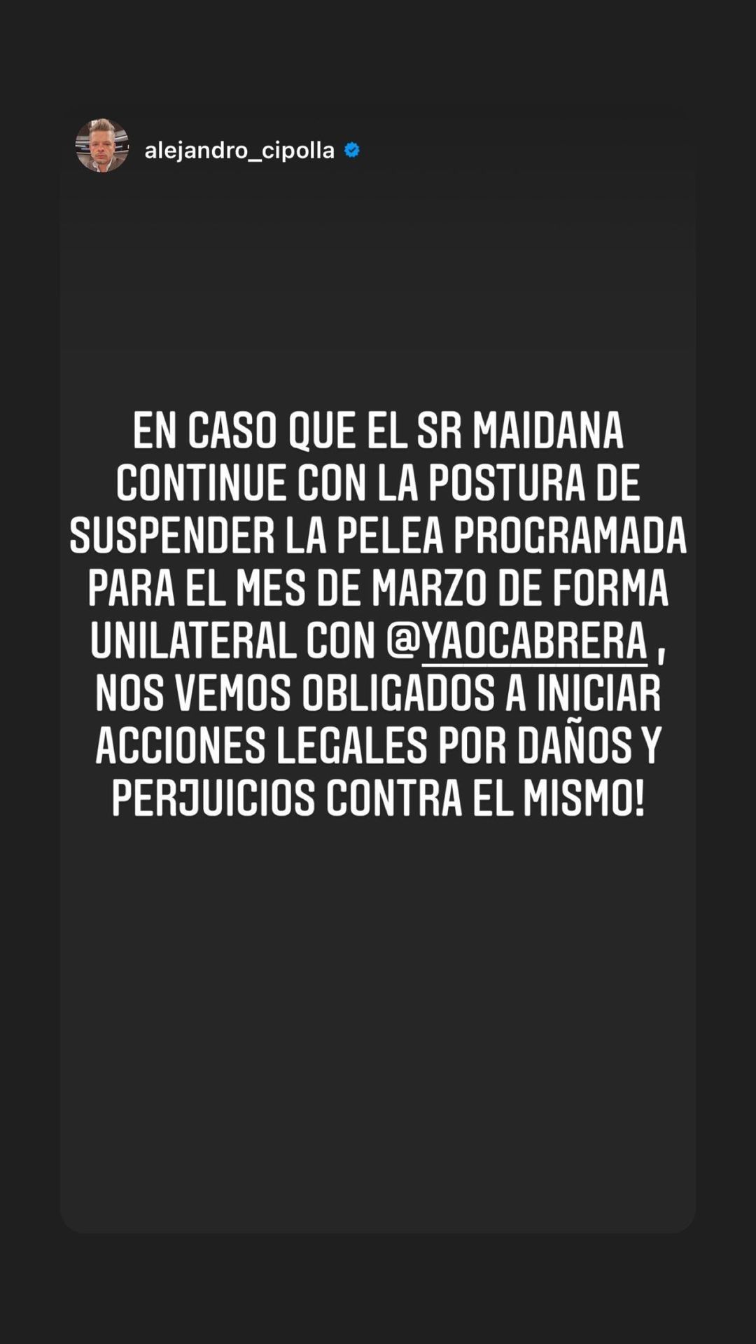 Indignado por el comunicado de Maidana, Cabrera estalló con un fuerte mensaje. "En caso de que el señor Maidana continúe con la postura de suspender la pelea programada para el mes de marzo de forma unilateral con Yao Cabrera, nos vemos obligados a iniciar acciones legales por daños y perjuicios contra el mismo”, aseguró Yao desde la red.