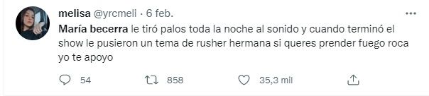 Como si esto fuera poco, cuando finalizó su presentación comenzó un tema de su ex. "María becerra terminó de tocar y el sonidista le manda el nuevo tema de Rusher. ¡Increíble!", publicó una de las fanáticas de la cantante en Twitter.