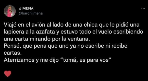 "Viajé en el avión al lado de una chica que le pidió una lapicera a la azafata y estuvo todo el vuelo escribiendo una carta mirando por la ventana. Pensé, 'qué pena que uno ya no escribe ni recibe cartas'. Aterrizamos y me dijo 'tomá, es para vos'", manifestó la cantante.