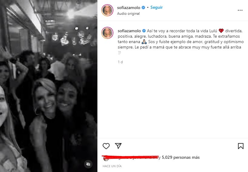 Zamolo se despidió de ella compartiendo un video en el que se las puede ver pasando diversos momentos juntas. "Así te voy a recordar toda la vida Lulú divertida, positiva, alegre, luchadora, buena amiga, madraza. Te extrañamos tanto enana. Sos y fuiste ejemplo de amor, gratitud y optimismo siempre". Para finalizar, también recordó a su mamá: "Le pedí a mamá que te abrace muy muy fuerte allá arriba".