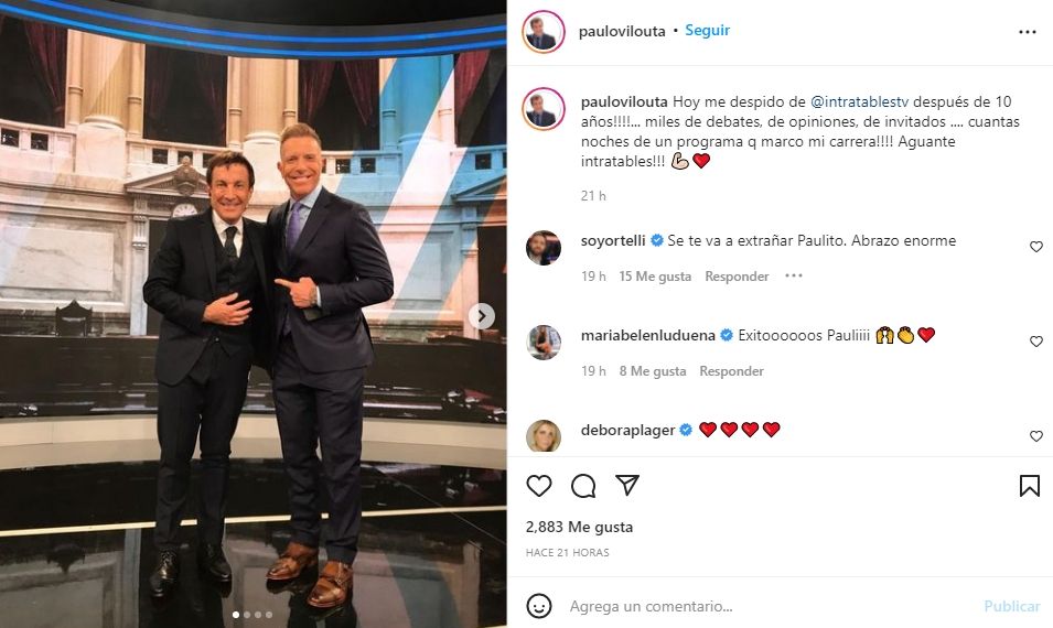 Fue a finales de febrero, cuando Vilouta anunció su salida y explicó el motivo durante su programa radial en La Red. "Bueno, les quería contar lo de Intratables porque ya trascendió y explotó por todos lados. Y en el ambiente nuestro no hay forma de mantener... no es un secreto pero sí es una negociación. Y después, explicar cómo es la situación porque siempre todo el mundo piensa que hay conflictos, que hay problemas", comenzó diciendo.