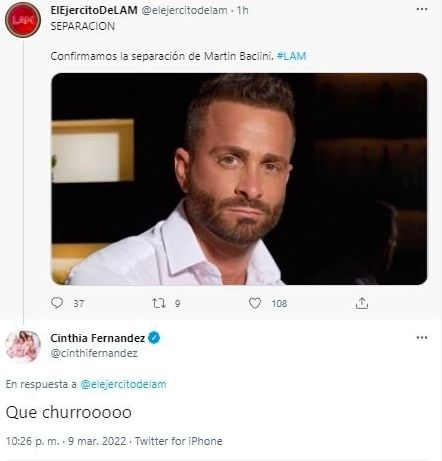 Además, hace algunos días atrás fue la misma Cinthia quien le respondió a un seguidor que le consultó por qué aún no había vuelto con Martín, y su respuesta fue más que honesta: “Porque estoy esperando a que se separe”.
