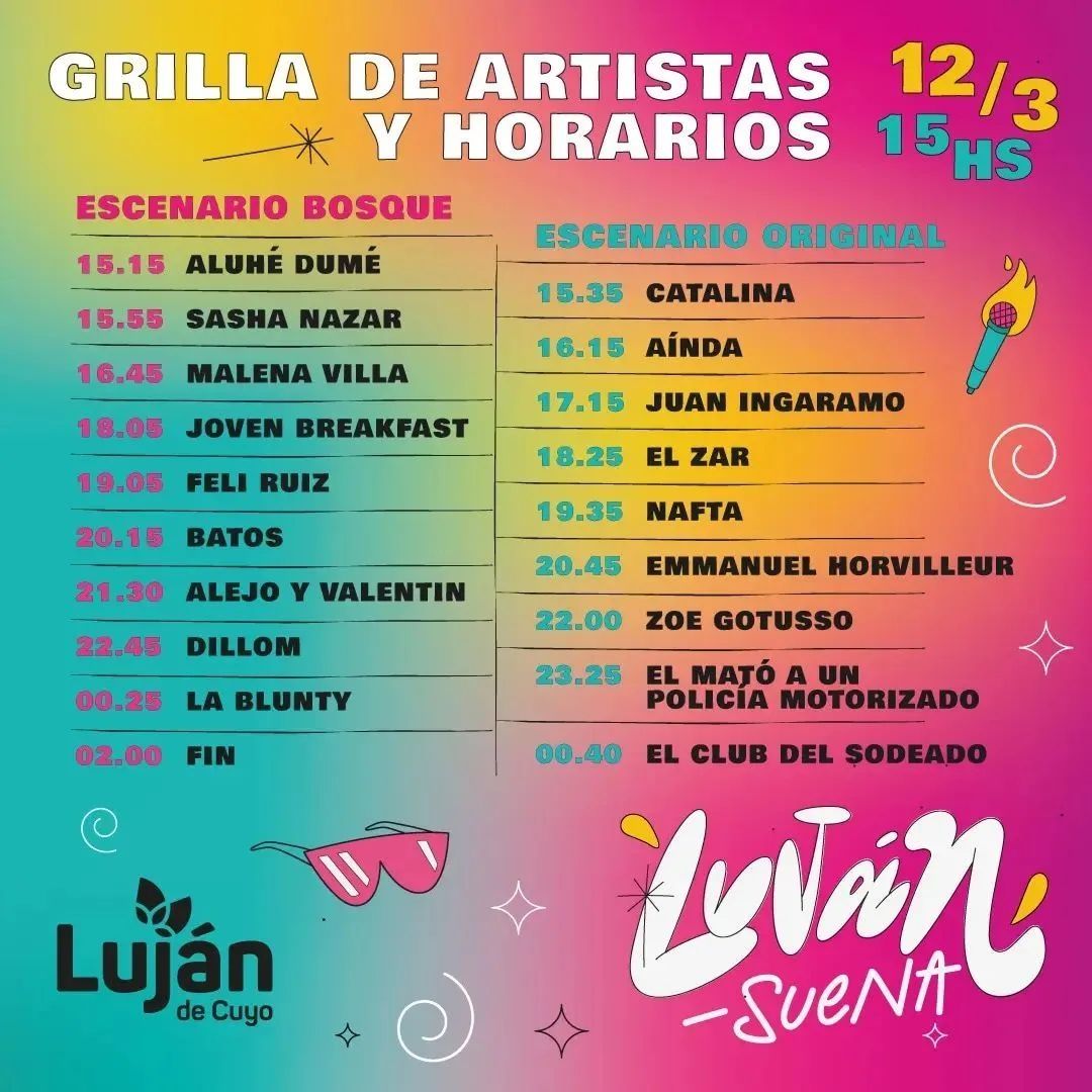 Este sábado 12 de marzo, a partir de las 15 horas, vuelve el Festival Luján Suena al Multiespacio Cultural Luján de Cuyo (ex Feriagro). Una fecha imperdible con más de quince bandas, dos escenarios y otros atractivos que se suman a la propuesta. Las entradas están a la venta por tuentrada.com.
