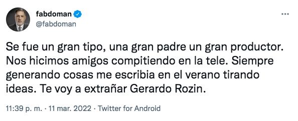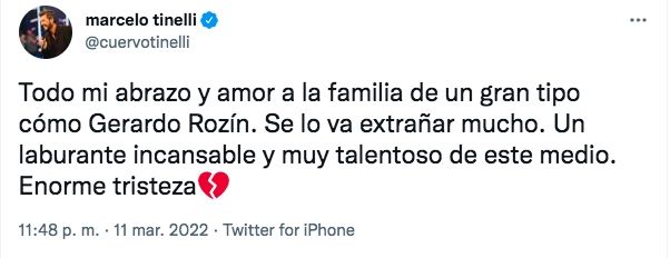 "Todo mi abrazo y amor a la familia de un gran tipo cómo Gerardo Rozín. Se lo va extrañar mucho. Un laburante incansable y muy talentoso de este medio. Enorme tristeza", expresó Marcelo Tinelli en su cuenta de Twitter.