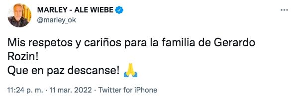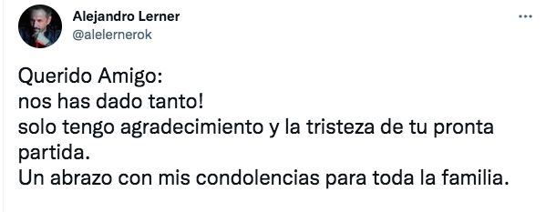 "Mis respetos y cariños para la familia de Gerardo Rozin! Que en paz descanse!", escribió Marley. "Querido Amigo: nos has dado tanto! Solo tengo agradecimiento y la tristeza de tu pronta partida. Un abrazo con mis condolencias para toda la familia", escribió Alejandro Lerner.