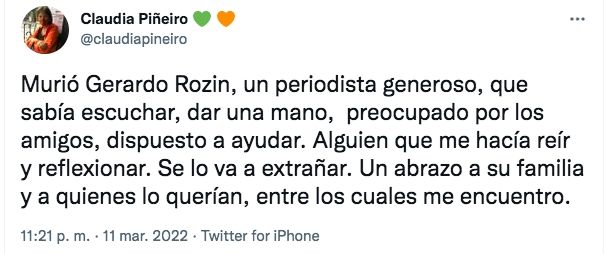 "Murió Gerardo Rozin, un periodista generoso, que sabía escuchar, dar una mano, preocupado por los amigos, dispuesto a ayudar. Alguien que me hacía reír y reflexionar. Se lo va a extrañar. Un abrazo a su familia y a quienes lo querían, entre los cuales me encuentro", dijo la escritora Claudia Piñeiro a través de un tweet.