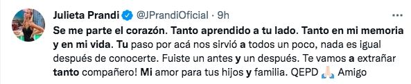 "Se me parte el corazón. Tanto aprendido a tu lado. Tanto en mi memoria y en mi vida. Tu paso por acá nos sirvió a todos un poco, nada es igual después de conocerte. Fuiste un antes y un después. Te vamos a extrañar tanto compañero! Mi amor para tus hijos y familia. QEPD Amigo", escribió con tristeza Julieta Prandi.
