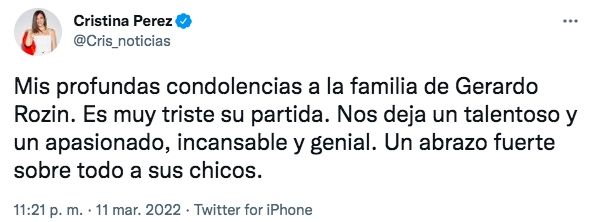 "Mis profundas condolencias a la familia de Gerardo Rozin. Es muy triste su partida. Nos deja un talentoso y un apasionado, incansable y genial. Un abrazo fuerte sobre todo a sus chicos", publicó Cristina Pérez.