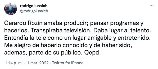 "Gerardo Rozín amaba producir; pensar programas y hacerlos. Transpiraba televisión. Daba lugar al talento. Entendía la tele como un lugar amigable y entretenido. Me alegro de haberlo conocido y de haber sido, ademas, parte de su público. Qepd", publicó Rodrigo Lussich. En tanto, Adrián Pallares, su compañero en Socios del Espectáculo, twitteó: "Gerardo QEPD! Abrazo a su familia y amigos! Un típazo. Un laburante de este medio!".
