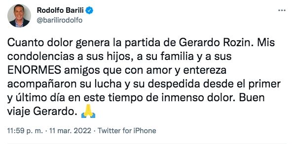"Que descanses en paz Gerardo Rozin Mi cariño para Carmela Bárbaro y toda su familia", expresó Ángel de Brito. "Cuanto dolor genera la partida de Gerardo Rozin. Mis condolencias a sus hijos, a su familia y a sus ENORMES amigos que con amor y entereza acompañaron su lucha y su despedida desde el primer y último día en este tiempo de inmenso dolor. Buen viaje Gerardo", publicó Rodolfo Barili.